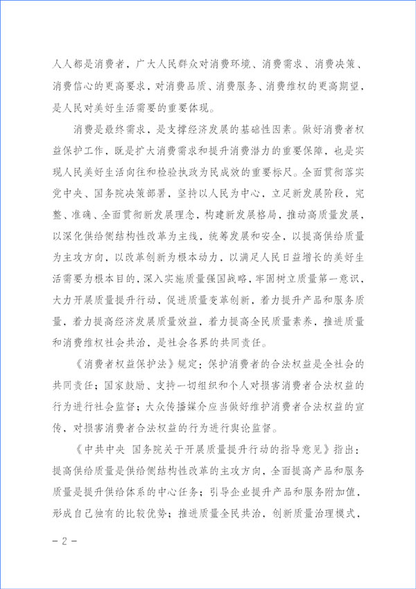 消費(fèi)是最終需求,是支撐經(jīng)濟(jì)發(fā)展的基礎(chǔ)性因素。做好消費(fèi)者權(quán)益保護(hù)工作,既是擴(kuò)大消費(fèi)需求和提升消費(fèi)潛力的重要保障,也是實(shí)現(xiàn)人民美好生活向往和檢驗(yàn)執(zhí)政為民成效的重要標(biāo)尺。全面貫徹落實(shí)黨中央、國(guó)務(wù)院決策部署,堅(jiān)持以人民為中心,立足新發(fā)展階段,完整、準(zhǔn)確、全面貫徹新發(fā)展理念,構(gòu)建新發(fā)展格局,推動(dòng)高質(zhì)量發(fā)展,以深化供給側(cè)結(jié)構(gòu)性改革為主線,統(tǒng)籌發(fā)展和安全,以提高供給質(zhì)量為主攻方向,以改革創(chuàng)新為根本動(dòng)力,以滿足人民日益增長(zhǎng)的美好生活需要為根本目的,深入實(shí)施質(zhì)量強(qiáng)國(guó)戰(zhàn)略,牢固樹(shù)立質(zhì)量第一意識(shí),大力開(kāi)展質(zhì)量提升行動(dòng),促進(jìn)質(zhì)量變革創(chuàng)新,著力提升產(chǎn)品和服務(wù)質(zhì)量,著力提高經(jīng)濟(jì)發(fā)展質(zhì)量效益,著力提高全民質(zhì)量素養(yǎng),推進(jìn)質(zhì)量和消費(fèi)維權(quán)社會(huì)共治,是社會(huì)各界的共同責(zé)任。