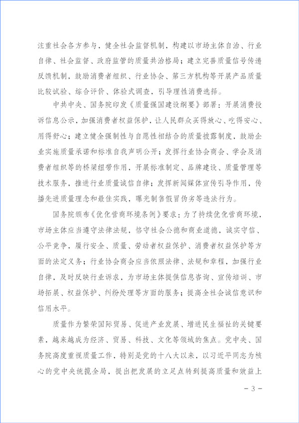 經(jīng)濟(jì)社會(huì)發(fā)展的動(dòng)力,源于市場(chǎng)主體的活力和社會(huì)創(chuàng)造力。本協(xié)會(huì)作為具有獨(dú)立法人資質(zhì)的社團(tuán)組織,在2023年“3·15”國(guó)際消費(fèi)者權(quán)益日“產(chǎn)品和服務(wù)質(zhì)量誠(chéng)信承諾”主題活動(dòng)中,充分發(fā)揮質(zhì)量檢驗(yàn)行業(yè)組織的職能職責(zé)優(yōu)勢(shì)和社團(tuán)中介機(jī)構(gòu)的橋梁紐帶作用,嚴(yán)格遵守相關(guān)法律法規(guī)和有關(guān)規(guī)定,堅(jiān)持以“切實(shí)為企業(yè)提供自愿參與的相關(guān)服務(wù)工作,不亂收費(fèi)、不增加企業(yè)負(fù)擔(dān),不干擾公平競(jìng)爭(zhēng),不干擾營(yíng)商環(huán)境,不干擾市場(chǎng)秩序,不干擾企業(yè)、企業(yè)相關(guān)負(fù)責(zé)人的正常生產(chǎn)生活,也不涉嫌評(píng)比或評(píng)價(jià)、排序,更不借活動(dòng)名義向企業(yè)攤派收費(fèi)、搭車(chē)收費(fèi)”為原則,充分發(fā)揮企業(yè)維護(hù)消費(fèi)者合法權(quán)益的市場(chǎng)主體作用,廣泛動(dòng)員廣大企業(yè)自愿參加本次活動(dòng),及時(shí)準(zhǔn)確地為廣大企業(yè)做好服務(wù)工作,全力為廣大企業(yè)提供力所能及的免費(fèi)增值服務(wù)而切實(shí)減輕企業(yè)負(fù)擔(dān),充分激發(fā)市場(chǎng)主體的活力和創(chuàng)造力,大力發(fā)揮新聞媒體的正面引導(dǎo)和輿論監(jiān)督作用,下最大氣力抓好質(zhì)量提升,大力推進(jìn)質(zhì)量社會(huì)共治,著力促進(jìn)消費(fèi)維權(quán)社會(huì)共治,引導(dǎo)動(dòng)員全社會(huì)切實(shí)維護(hù)消費(fèi)者合法權(quán)益,促進(jìn)消費(fèi)升級(jí),改善消費(fèi)體驗(yàn),全力營(yíng)造質(zhì)量誠(chéng)信社會(huì)共治的氛圍,提振消費(fèi)信心,不斷滿足人民群眾對(duì)美好生活的更高要求,持續(xù)為我國(guó)經(jīng)濟(jì)構(gòu)建新發(fā)展格局和高質(zhì)量發(fā)展與質(zhì)量強(qiáng)國(guó)建設(shè)作出積極貢獻(xiàn)。