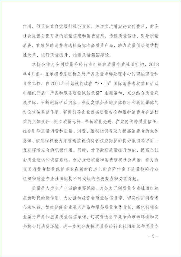 本協(xié)會(huì)作為全國(guó)質(zhì)量檢驗(yàn)行業(yè)組織和質(zhì)量專(zhuān)業(yè)社團(tuán)機(jī)構(gòu),2018年4月前一直承擔(dān)著原質(zhì)檢總局產(chǎn)品質(zhì)量申訴處理中心的職能職責(zé)和日常工作,自2000年開(kāi)始就持續(xù)在“3·15”國(guó)際消費(fèi)者權(quán)益日活動(dòng)中組織開(kāi)展“產(chǎn)品和服務(wù)質(zhì)量誠(chéng)信承諾”主題活動(dòng),充分結(jié)合質(zhì)量發(fā)展實(shí)際,不斷創(chuàng)新活動(dòng)內(nèi)容,積極發(fā)揮企業(yè)的主體作用和新聞媒體的輿論宣傳監(jiān)督作用,督促引導(dǎo)企業(yè)落實(shí)質(zhì)量安全和維護(hù)消費(fèi)者合法權(quán)益的主體責(zé)任,樹(shù)立質(zhì)量標(biāo)桿,弘揚(yáng)質(zhì)量先進(jìn),在宣傳傳遞質(zhì)量信任、推介引導(dǎo)質(zhì)量消費(fèi)和質(zhì)量、消費(fèi)、維權(quán)知識(shí)普及與提高消費(fèi)者的主體意識(shí)、依法維權(quán)能力并營(yíng)造重視消費(fèi)者權(quán)益保護(hù)的良好氛圍等方面一直發(fā)揮著應(yīng)有的積極作用。同時(shí),對(duì)于激發(fā)質(zhì)量提升動(dòng)能,提高全社會(huì)質(zhì)量意識(shí)和誠(chéng)信意識(shí),合力推進(jìn)質(zhì)量和消費(fèi)維權(quán)社會(huì)共治,著力為我國(guó)消費(fèi)者權(quán)益保護(hù)事業(yè)在新時(shí)代邁上新臺(tái)階作出了質(zhì)量檢驗(yàn)行業(yè)組織和質(zhì)量專(zhuān)業(yè)社團(tuán)機(jī)構(gòu)不可或缺的積極努力和必要貢獻(xiàn)。