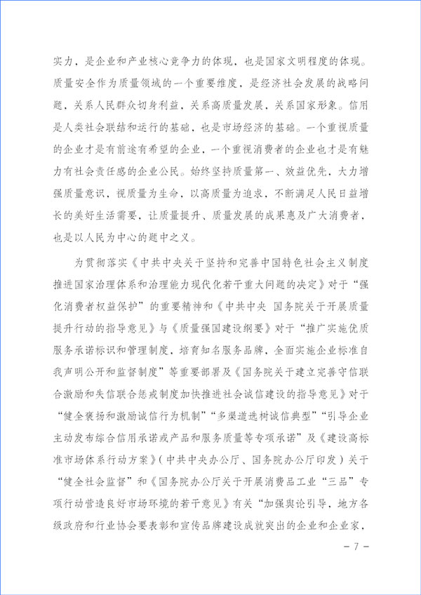 質(zhì)量興則經(jīng)濟(jì)興,質(zhì)量強(qiáng)則國(guó)家強(qiáng)。質(zhì)量反映一個(gè)國(guó)家的綜合實(shí)力,是企業(yè)和產(chǎn)業(yè)核心競(jìng)爭(zhēng)力的體現(xiàn),也是國(guó)家文明程度的體現(xiàn)。質(zhì)量安全作為質(zhì)量領(lǐng)域的一個(gè)重要維度,是經(jīng)濟(jì)社會(huì)發(fā)展的戰(zhàn)略問(wèn)題,關(guān)系人民群眾切身利益,關(guān)系高質(zhì)量發(fā)展,關(guān)系國(guó)家形象。信用是人類(lèi)社會(huì)聯(lián)結(jié)和運(yùn)行的基礎(chǔ),也是市場(chǎng)經(jīng)濟(jì)的基礎(chǔ)。一個(gè)重視質(zhì)量的企業(yè)才是有前途有希望的企業(yè),一個(gè)重視消費(fèi)者的企業(yè)也才是有魅力有社會(huì)責(zé)任感的企業(yè)公民。始終堅(jiān)持質(zhì)量第一、效益優(yōu)先,大力增強(qiáng)質(zhì)量意識(shí),視質(zhì)量為生命,以高質(zhì)量為追求,不斷滿足人民日益增長(zhǎng)的美好生活需要,讓質(zhì)量提升、質(zhì)量發(fā)展的成果惠及廣大消費(fèi)者,也是以人民為中心的題中之義。