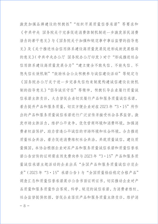 為貫徹落實(shí)《中共中央關(guān)于堅(jiān)持和完善中國(guó)特色社會(huì)主義制度 推進(jìn)國(guó)家治理體系和治理能力現(xiàn)代化若干重大問(wèn)題的決定》對(duì)于“強(qiáng)化消費(fèi)者權(quán)益保護(hù)”的重要精神和《中共中央 國(guó)務(wù)院關(guān)于開(kāi)展質(zhì)量提升行動(dòng)的指導(dǎo)意見(jiàn)》與《質(zhì)量強(qiáng)國(guó)建設(shè)綱要》對(duì)于“推廣實(shí)施優(yōu)質(zhì)服務(wù)承諾標(biāo)識(shí)和管理制度,培育知名服務(wù)品牌,全面實(shí)施企業(yè)標(biāo)準(zhǔn)自我聲明公開(kāi)和監(jiān)督制度”等重要部署及《國(guó)務(wù)院關(guān)于建立完善守信聯(lián)合激勵(lì)和失信聯(lián)合懲戒制度加快推進(jìn)社會(huì)誠(chéng)信建設(shè)的指導(dǎo)意見(jiàn)》對(duì)于“健全褒揚(yáng)和激勵(lì)誠(chéng)信行為機(jī)制”“多渠道選樹(shù)誠(chéng)信典型”“引導(dǎo)企業(yè)主動(dòng)發(fā)布綜合信用承諾或產(chǎn)品和服務(wù)質(zhì)量等專(zhuān)項(xiàng)承諾”及《建設(shè)高標(biāo)準(zhǔn)市場(chǎng)體系行動(dòng)方案》(中共中央辦公廳、國(guó)務(wù)院辦公廳印發(fā))關(guān)于“健全社會(huì)監(jiān)督”和《國(guó)務(wù)院辦公廳關(guān)于開(kāi)展消費(fèi)品工業(yè)“三品”專(zhuān)項(xiàng)行動(dòng)營(yíng)造良好市場(chǎng)環(huán)境的若干意見(jiàn)》有關(guān)“加強(qiáng)輿論引導(dǎo),地方各級(jí)政府和行業(yè)協(xié)會(huì)要表彰和宣傳品牌建設(shè)成就突出的企業(yè)和企業(yè)家,激發(fā)加強(qiáng)品牌建設(shè)的積極性”“組織開(kāi)展質(zhì)量信譽(yù)承諾”等要求和《中共中央 國(guó)務(wù)院關(guān)于完善促進(jìn)消費(fèi)體制機(jī)制進(jìn)一步激發(fā)居民消費(fèi)潛力的若干意見(jiàn)》與《國(guó)務(wù)院關(guān)于加強(qiáng)和規(guī)范事中事后監(jiān)管的指導(dǎo)意見(jiàn)》及《關(guān)于推進(jìn)社會(huì)信用體系建設(shè)高質(zhì)量發(fā)展促進(jìn)形成新發(fā)展格局的意見(jiàn)》(中共中央辦公廳 國(guó)務(wù)院辦公廳印發(fā))對(duì)于“形成推進(jìn)社會(huì)信用體系建設(shè)高質(zhì)量發(fā)展合力”“建立健全不敢失信、不能失信、不想失信長(zhǎng)效機(jī)制”“鼓勵(lì)社會(huì)公眾積極參與誠(chéng)信建設(shè)活動(dòng)”等規(guī)定與《國(guó)務(wù)院辦公廳關(guān)于進(jìn)一步完善失信約束制度構(gòu)建誠(chéng)信建設(shè)長(zhǎng)效機(jī)制的指導(dǎo)意見(jiàn)》“倡導(dǎo)誠(chéng)實(shí)守信”等精神,積極引導(dǎo)企業(yè)履行質(zhì)量誠(chéng)信承諾主體責(zé)任,大力督促企業(yè)切實(shí)履行產(chǎn)品和服務(wù)質(zhì)量誠(chéng)信承諾,著力提升產(chǎn)品和服務(wù)質(zhì)量,切實(shí)方便企業(yè)對(duì)在2023年“3·15”所作出的產(chǎn)品和服務(wù)質(zhì)量誠(chéng)信承諾進(jìn)行廣泛宣傳并接受社會(huì)各界監(jiān)督,激發(fā)市場(chǎng)主體活力,維護(hù)公平競(jìng)爭(zhēng),優(yōu)化營(yíng)商環(huán)境和消費(fèi)環(huán)境,加強(qiáng)消費(fèi)者權(quán)益保護(hù),助力營(yíng)造公平誠(chéng)信的市場(chǎng)環(huán)境和社會(huì)環(huán)境,合力推進(jìn)質(zhì)量社會(huì)共治,著力促進(jìn)消費(fèi)維權(quán)社會(huì)共治,共筑質(zhì)量誠(chéng)信,建設(shè)質(zhì)量強(qiáng)國(guó),本協(xié)會(huì)根據(jù)企業(yè)對(duì)其產(chǎn)品和服務(wù)質(zhì)量誠(chéng)信承諾和質(zhì)量信譽(yù)承諾公告宣傳的證明需求而免費(fèi)向參與2023年“3·15”產(chǎn)品和服務(wù)質(zhì)量誠(chéng)信承諾主題活動(dòng)的企業(yè)出具“全國(guó)產(chǎn)品和服務(wù)質(zhì)量誠(chéng)信示范企業(yè)”(2023年“3·15”承諾公告)與“全國(guó)質(zhì)量檢驗(yàn)穩(wěn)定合格產(chǎn)品”調(diào)查匯總和質(zhì)量信譽(yù)承諾展示公告書(shū)面證明證書(shū),切實(shí)推動(dòng)企業(yè)對(duì)產(chǎn)品質(zhì)量和服務(wù)質(zhì)量作出客觀、科學(xué)、規(guī)范的誠(chéng)信承諾,為消費(fèi)者維權(quán)、社會(huì)監(jiān)督提供依據(jù),督促企業(yè)落實(shí)產(chǎn)品和服務(wù)質(zhì)量主體責(zé)任,維護(hù)消費(fèi)者合法權(quán)益,不斷增強(qiáng)人民群眾對(duì)質(zhì)量的獲得感、幸福感、安全感。本協(xié)會(huì)在本次活動(dòng)中向企業(yè)所出具的書(shū)面證明證書(shū),謹(jǐn)系企業(yè)公開(kāi)發(fā)布產(chǎn)品和服務(wù)質(zhì)量專(zhuān)項(xiàng)承諾與企業(yè)主動(dòng)公告質(zhì)量信譽(yù)情況的公告證明,不涉及評(píng)比或評(píng)價(jià)、排序。