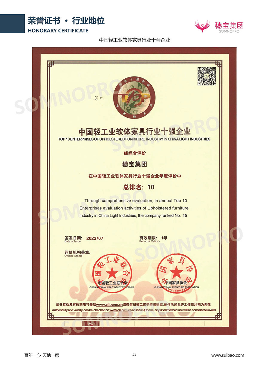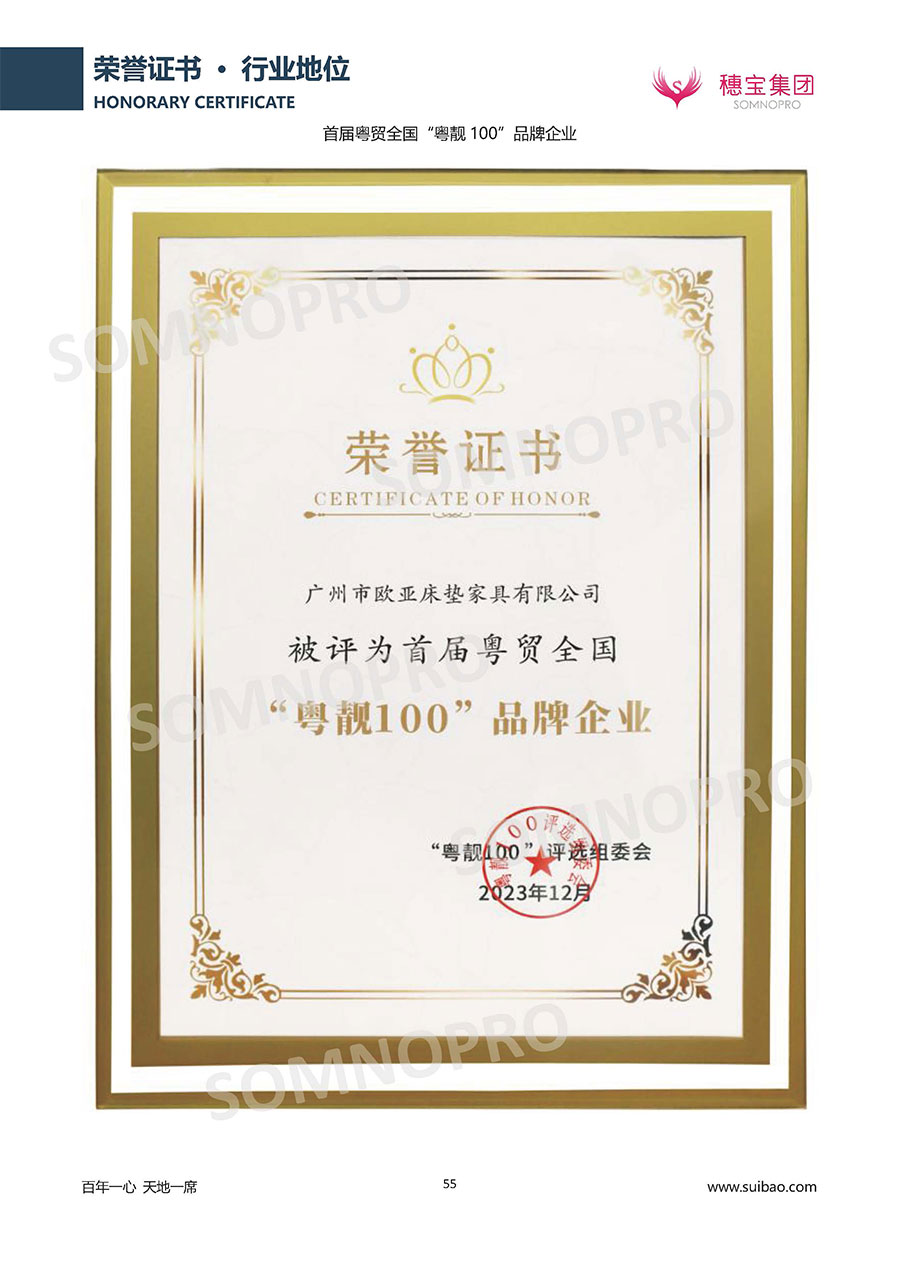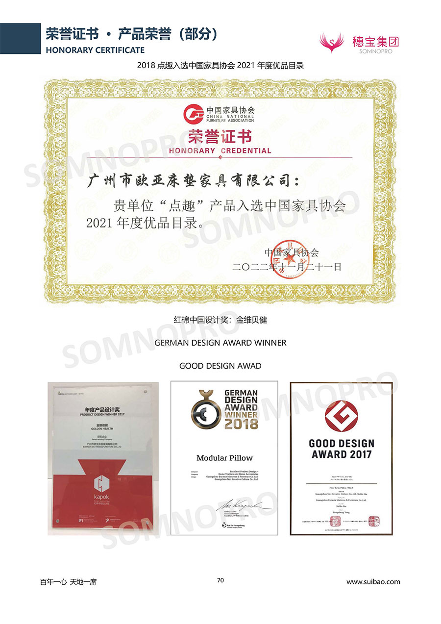 自1971年獨立研發(fā)生產(chǎn)出專屬國人的彈簧床墊,穗寶關(guān)于優(yōu)質(zhì)深度睡眠的研究已有半個世紀(jì)的歷史。穗寶一直專注床墊,專注中國消費者的睡眠研究,針對中國人特點進(jìn)行優(yōu)化創(chuàng)新,不斷提升國人的睡眠體驗,只為成就每個晚上8小時的優(yōu)質(zhì)深度睡眠。憑借不斷革新的研發(fā)科技和深受消費者信賴的產(chǎn)品品質(zhì),穗寶集團(tuán)旗下品牌和產(chǎn)品屢獲國內(nèi)外大獎,連續(xù)20年榮膺中國500最具價值品牌,品牌價值高達(dá)302.89億元。