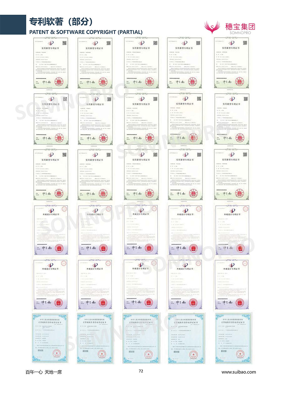 穗寶集團(tuán)遍訪全球,深度整合世界優(yōu)質(zhì)資源,專注睡眠研究,與世界家具材料行業(yè)領(lǐng)導(dǎo)者禮恩派集團(tuán)結(jié)成戰(zhàn)略伙伴,成立睡眠研究中心和彈簧網(wǎng)檢測中心,引入床墊鋪面耐久性測試儀,材料拉力測試儀,床墊撓度曲線測試儀,為產(chǎn)品注入優(yōu)秀基因;成功研發(fā)推出IFEEL深睡感知系統(tǒng)、X7研發(fā)系統(tǒng),關(guān)注消費者每一個細(xì)微的睡眠需求,致力于以科學(xué)的方式創(chuàng)造優(yōu)異的物理與心理助眠條件,幫助現(xiàn)代人獲得優(yōu)質(zhì)深度睡眠;不斷創(chuàng)新進(jìn)取,軀位步技術(shù)、T-GUARD衡力支承系統(tǒng)等多項成果獲國內(nèi)國際專利。