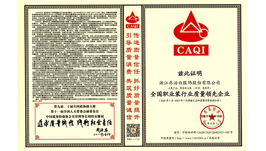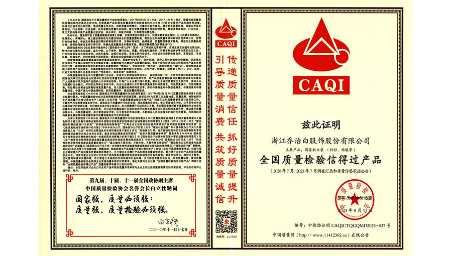 喬治白先后榮獲中國名牌產(chǎn)品、中國職業(yè)裝十大領(lǐng)軍企業(yè)、全國守合同重信用單位、國家級綠色工廠、浙江省智能工廠等榮譽(yù)稱號。作為全國標(biāo)準(zhǔn)化工作先進(jìn)單位,喬治白積極參與標(biāo)準(zhǔn)化工作,先后參與《職業(yè)裝檢驗規(guī)則》、《襯衫》、《女西服、大衣》等9項國家標(biāo)準(zhǔn)的起草與修訂工作,《全毛襯西服》行業(yè)標(biāo)準(zhǔn)起草。
