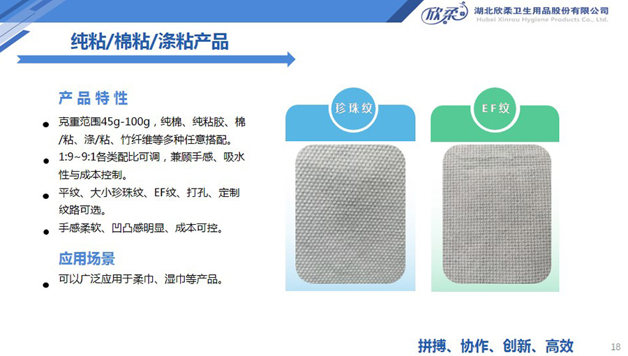 欣柔是以一次性醫(yī)衛(wèi)及生活用非織造材料為主導(dǎo),同時集生產(chǎn)銷售醫(yī)衛(wèi)用脫脂纖維和擦拭類終端產(chǎn)品的高新技術(shù)企業(yè),欣柔秉承“人才為本,科技領(lǐng)先,用戶至上”的經(jīng)營理念,努力打造成為一家以研發(fā)創(chuàng)新為驅(qū)動力,以功能型、差異化產(chǎn)品為牽引力的專業(yè)醫(yī)衛(wèi)用非織造材料供應(yīng)商及生活用品提供商。