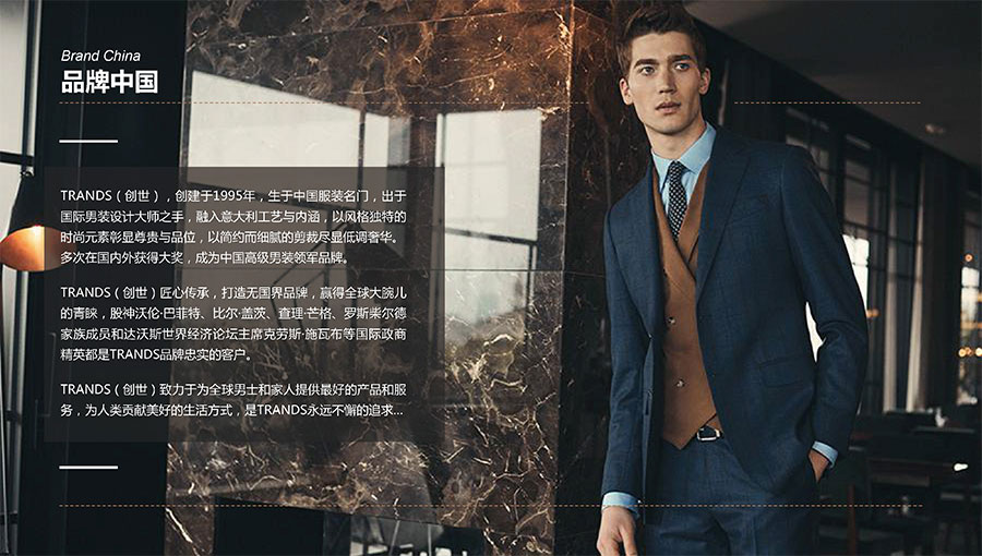 創(chuàng)世品牌(TRANDS):創(chuàng)建于1995年,是當(dāng)今中國(guó)高級(jí)男裝的代表品牌之一。TRANDS創(chuàng)世成衣產(chǎn)品及量身定制的西裝以其至臻品質(zhì)和精湛工藝,贏得眾多國(guó)際政商精英多年來(lái)的青睞。