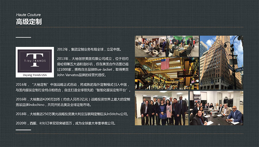 大楊集團(tuán)主要從事生產(chǎn)和銷(xiāo)售各類中高檔服裝產(chǎn)品,以西裝縫制享譽(yù)全球。年服裝綜合生產(chǎn)加工能力1100萬(wàn)件/套,年西服出口量600萬(wàn)件/套,年服裝定制產(chǎn)量200萬(wàn)件/套,連續(xù)多年排名全國(guó)第一,是全球重要的西裝生產(chǎn)基地。