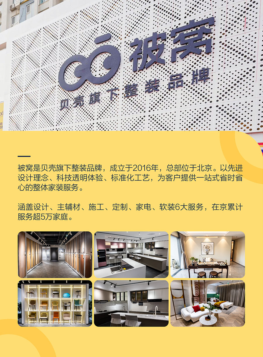 被窩,是貝殼旗下整裝品牌,成立于2016年,總部位于北京。以先進(jìn)設(shè)計理念、科技透明體驗、標(biāo)準(zhǔn)化工藝,為客戶提供一站式省時省心的整體家裝服務(wù)。涵蓋設(shè)計、主輔材、施工、定制、家電、軟裝6大服務(wù)。
