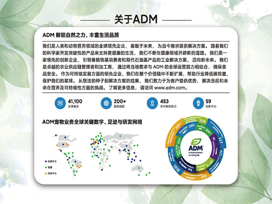 ADM作為人類、動(dòng)物及寵物營(yíng)養(yǎng)領(lǐng)域的全球前沿企業(yè),致力于寵物營(yíng)養(yǎng)領(lǐng)域的創(chuàng)新,不斷開發(fā)出突破性的寵物產(chǎn)品,為中國(guó)的養(yǎng)寵家庭提供更加全面、精準(zhǔn)的營(yíng)養(yǎng)解決方案。
