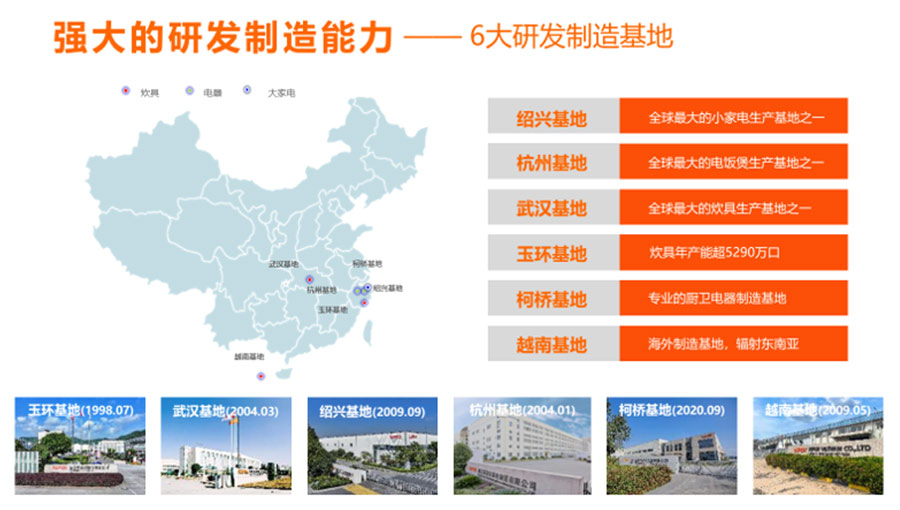 浙江蘇泊爾股份有限公司是中國最大、全球第二的炊具研發(fā)制造商之一,中國廚房小家電領先品牌。在杭州、玉環(huán)、紹興、武漢和越南建立了5大研發(fā)制造基地,擁有1萬多名員工。蘇泊爾是中國炊具行業(yè)首家上市公司(股票代碼002032)。浙江蘇泊爾家電制造有限公司是浙江蘇泊爾股份有限公司的控股子公司,注冊資本13369萬元,自2004年1月成立,主要生產電飯煲、電蒸鍋、電燉鍋、煎烤器等廚房小家電產品。2023年營收達到40.83億元,擁有2100多名員工,目前為中國最大的電飯煲生產基地之一。