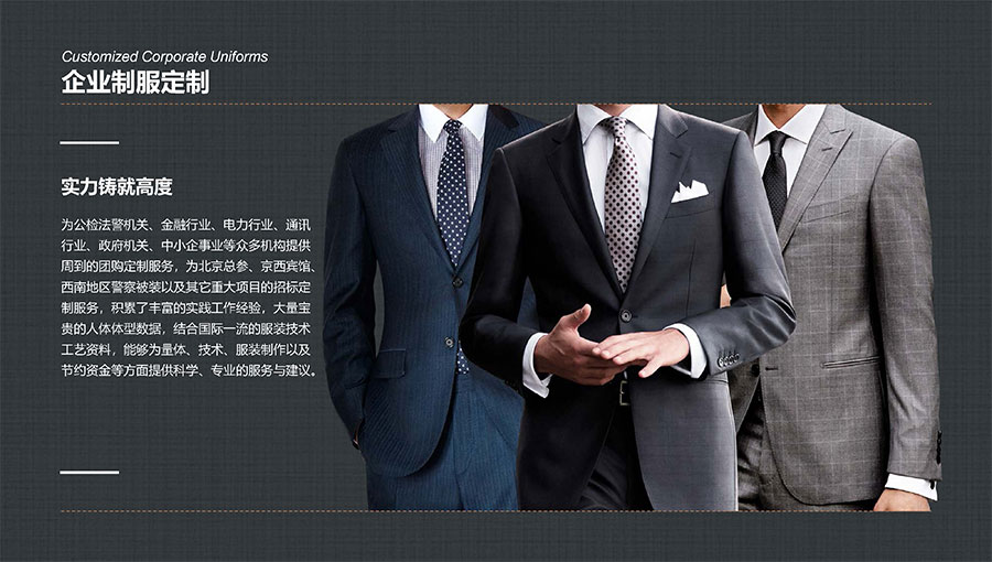 凱門(mén)品牌(KEYYMEN):高級(jí)職業(yè)裝品牌,企業(yè)形象定制專(zhuān)家。以精湛工藝及最優(yōu)性?xún)r(jià)比打造高品質(zhì)、個(gè)性時(shí)尚的企業(yè)形象,專(zhuān)屬于那些為理想、為事業(yè)打拼,并在成功過(guò)程中享受生活的職場(chǎng)團(tuán)隊(duì)及精英人士。