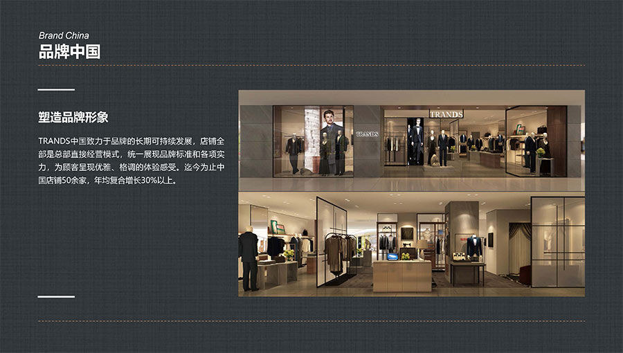創(chuàng)世品牌(TRANDS):創(chuàng)建于1995年,是當(dāng)今中國(guó)高級(jí)男裝的代表品牌之一。TRANDS創(chuàng)世成衣產(chǎn)品及量身定制的西裝以其至臻品質(zhì)和精湛工藝,贏得眾多國(guó)際政商精英多年來(lái)的青睞。