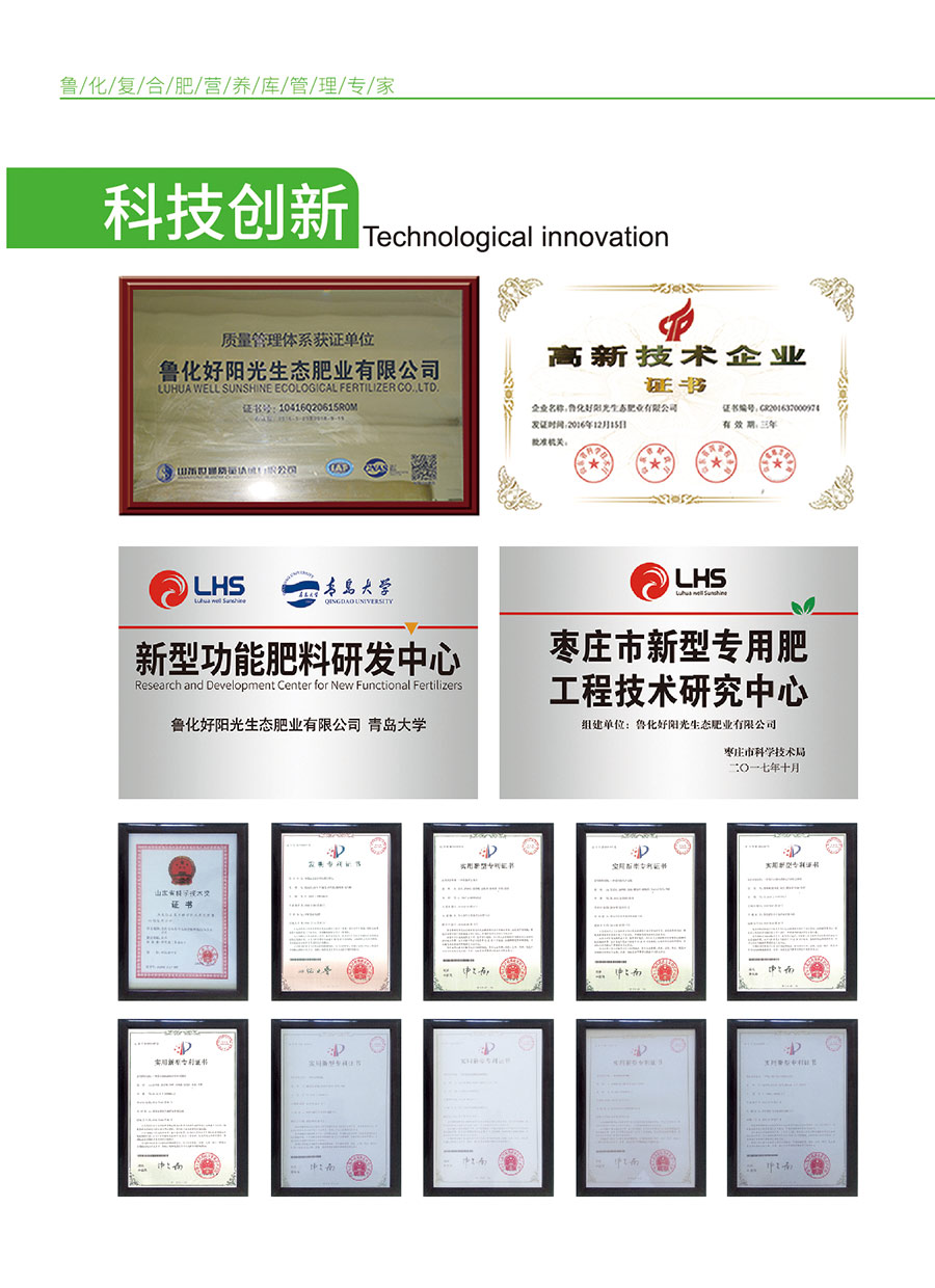 魯化好陽(yáng)光秉承“營(yíng)養(yǎng)庫(kù)管理專家”的理念,致力于肥料的高效利用,服務(wù)農(nóng)業(yè)生產(chǎn)。魯化好陽(yáng)光已獲得國(guó)家高新技術(shù)企業(yè)認(rèn)證、ISO9001質(zhì)量體系認(rèn)證等多項(xiàng)管理資質(zhì)證書(shū)。和青島大學(xué)、滕州市馬鈴薯品牌培育產(chǎn)業(yè)發(fā)展研究所等多所大學(xué)、研究機(jī)構(gòu)合作,建立新型肥料研發(fā)中心,取得了豐碩成果。