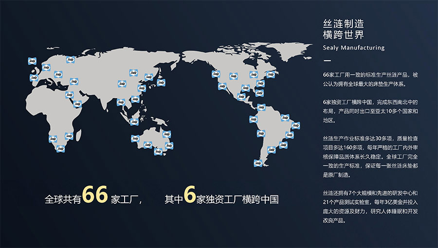 66家工廠用一致的標準生產(chǎn)絲漣產(chǎn)品,被公認為擁有全球最大的床墊生產(chǎn)體系。