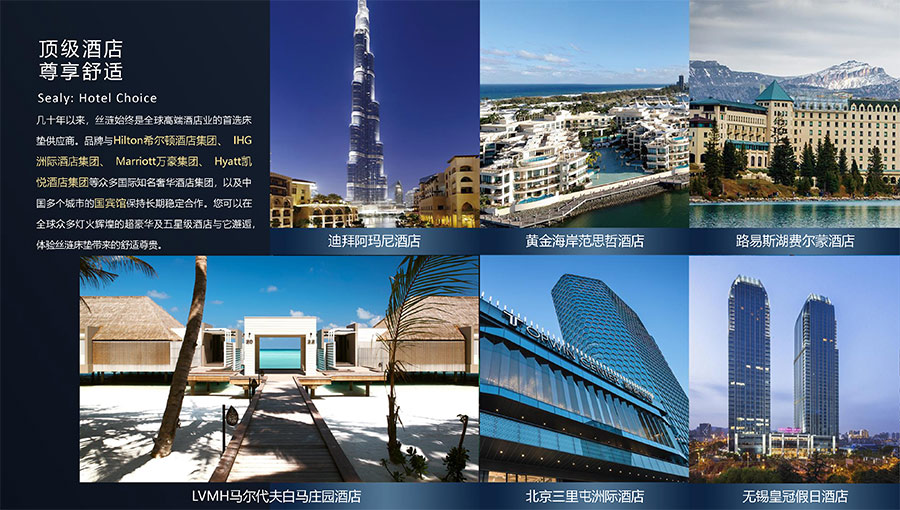 幾十年以來,絲漣始終是全球高端酒店業(yè)的首選床墊供應商。品牌與Hilton希爾頓酒店集團、IHG洲際酒店集團、Marriott萬豪集團、Hyatt凱悅酒店集團等眾多國際知名奢華酒店集團,以及中國多個城市的國賓館保持長期穩(wěn)定合作。您可以在全球眾多燈火輝煌的超豪華及五星級酒店與它邂逅,體驗絲漣床墊帶來的舒適尊貴。