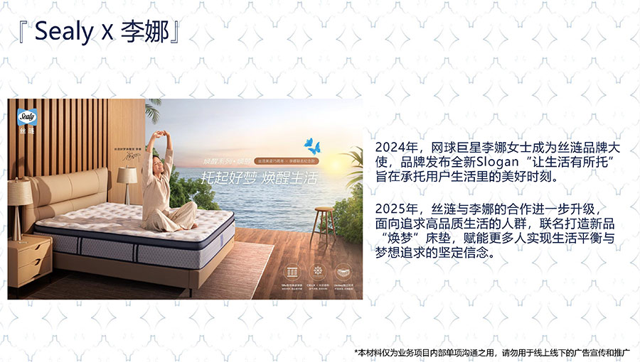 絲漣是上海勞力士大師賽唯一指定床墊及床品品牌,以承托優(yōu)質好眠為基礎,在熱力揮拍之間盡享優(yōu)雅與時尚的健康生活方式。