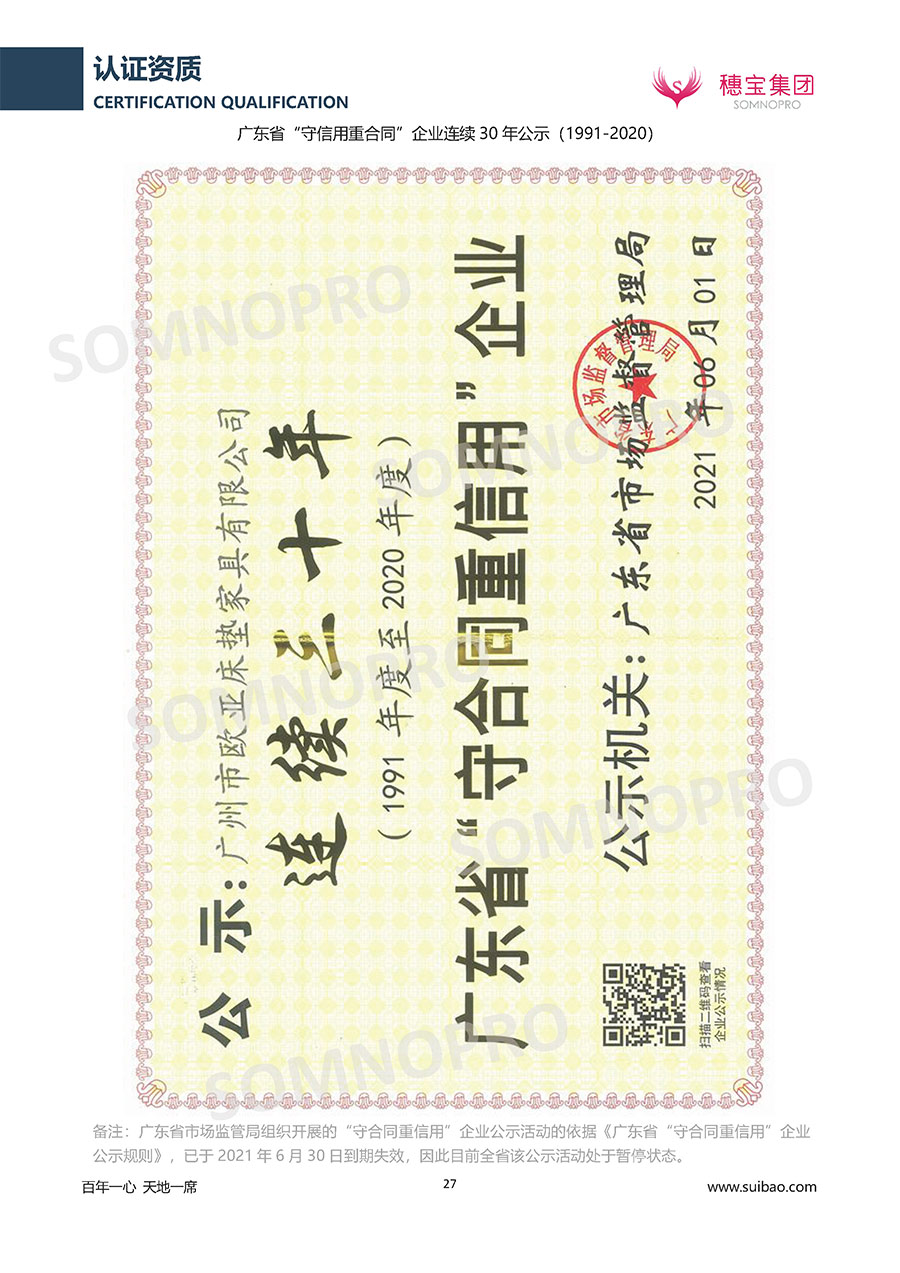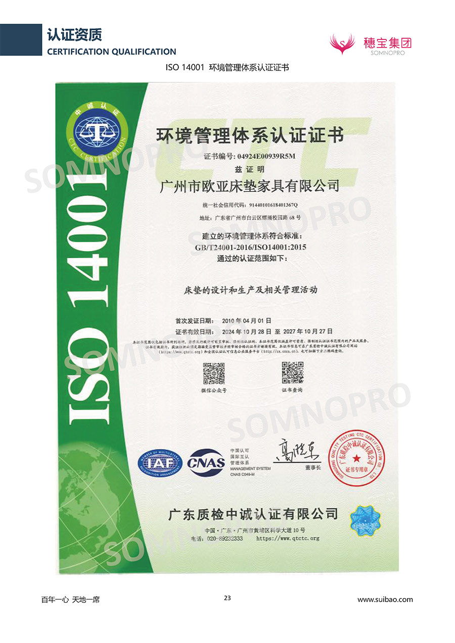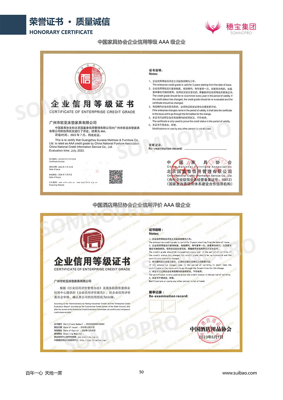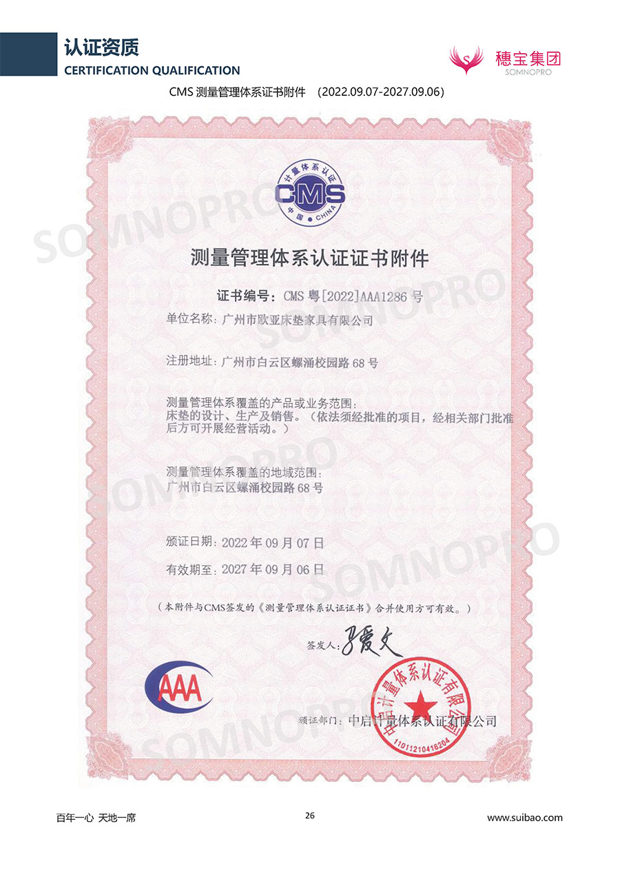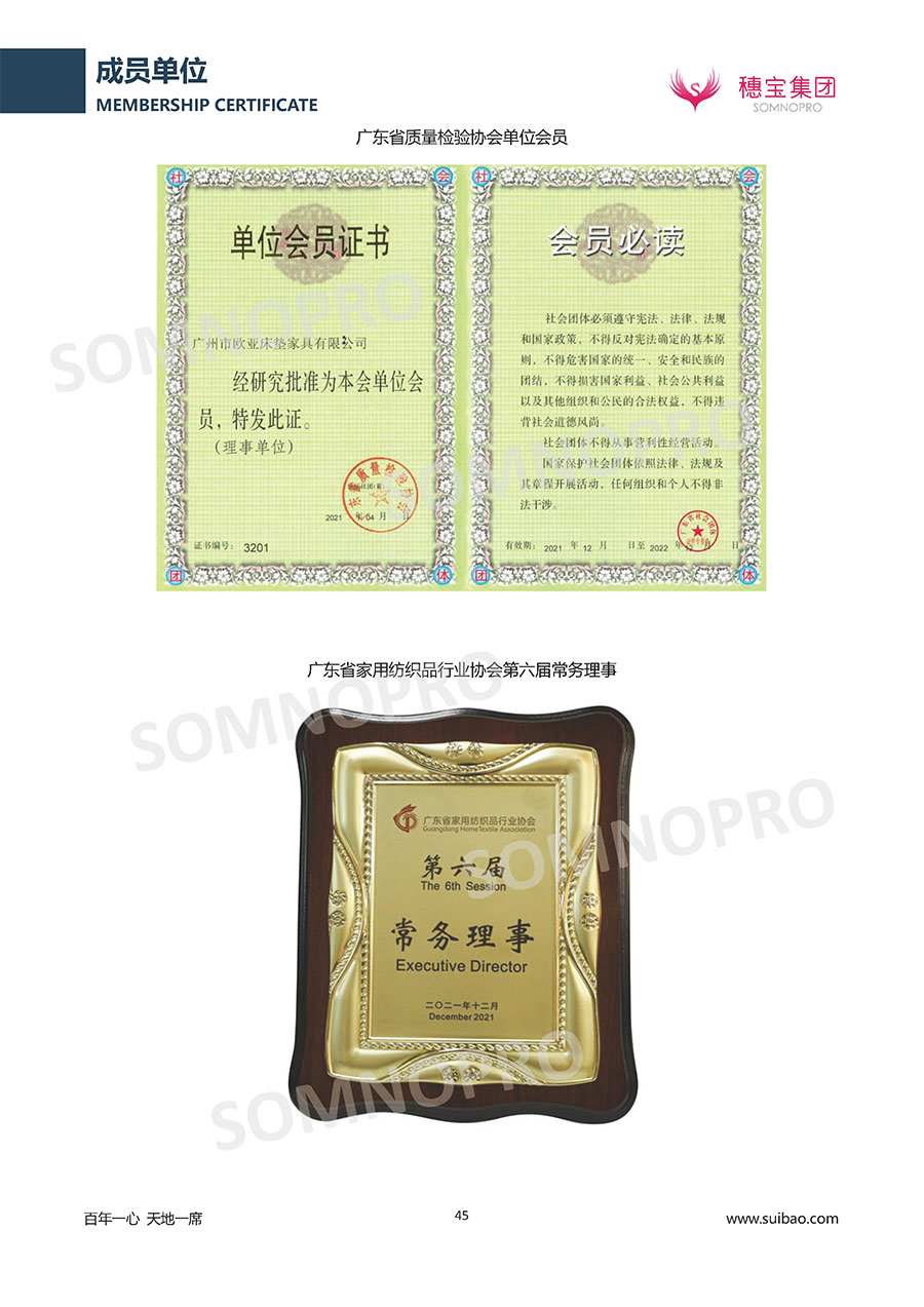 本著高品質(zhì)、高效率、重管理的原則,穗寶已通過ISO9001質(zhì)量管理體系認(rèn)證證書、ISO14001環(huán)境管理體系認(rèn)證證書、ISO45001職業(yè)健康安全管理體系認(rèn)證證書、中國(guó)環(huán)境標(biāo)志產(chǎn)品認(rèn)證證書、家居綠色環(huán)保領(lǐng)跑品牌、綠色正品家居品牌、企業(yè)標(biāo)準(zhǔn)“綠色領(lǐng)跑者”證書、CMS測(cè)量管理體系證書、CMS測(cè)量管理體系證書附件、廣東省“守信用重合同”企業(yè)、廣州歐亞-納稅信用A級(jí)納稅人(連續(xù)5年:2018-2022)、2024年中國(guó)500最具價(jià)值品牌,品牌價(jià)值高達(dá)302.89億元、廣東高價(jià)值商標(biāo)品牌(穗寶)、廣東省重點(diǎn)商標(biāo)保護(hù)名錄納入證明、廣州市勞動(dòng)關(guān)系和諧企業(yè)AA級(jí)。穗寶自創(chuàng)立以來,不斷致力于新產(chǎn)品的設(shè)計(jì)與研發(fā),多次在國(guó)內(nèi)家具展會(huì)屢獲獎(jiǎng)項(xiàng),產(chǎn)品暢銷國(guó)內(nèi)外,深受客戶一致好評(píng)。
