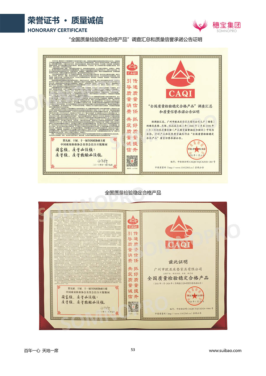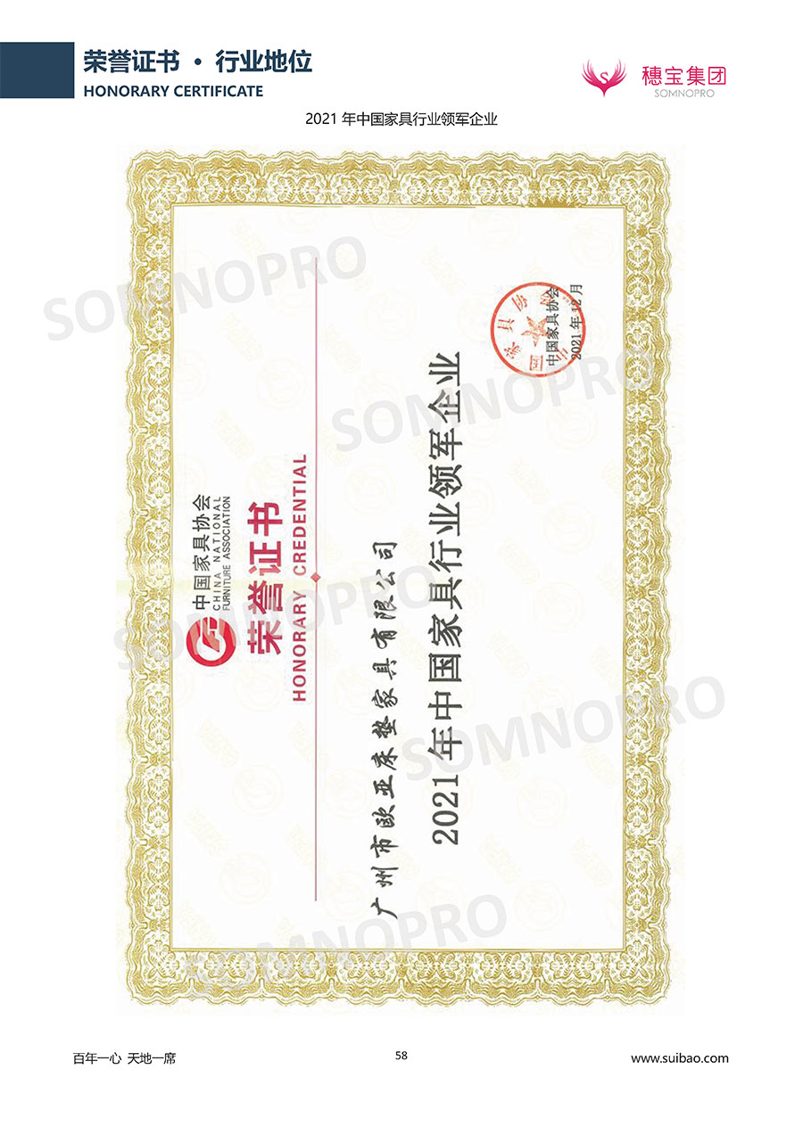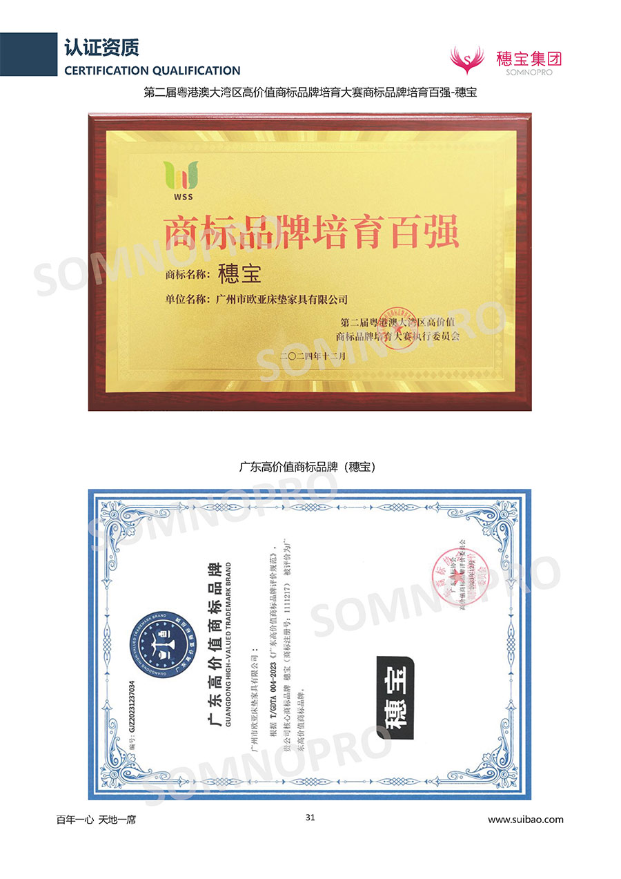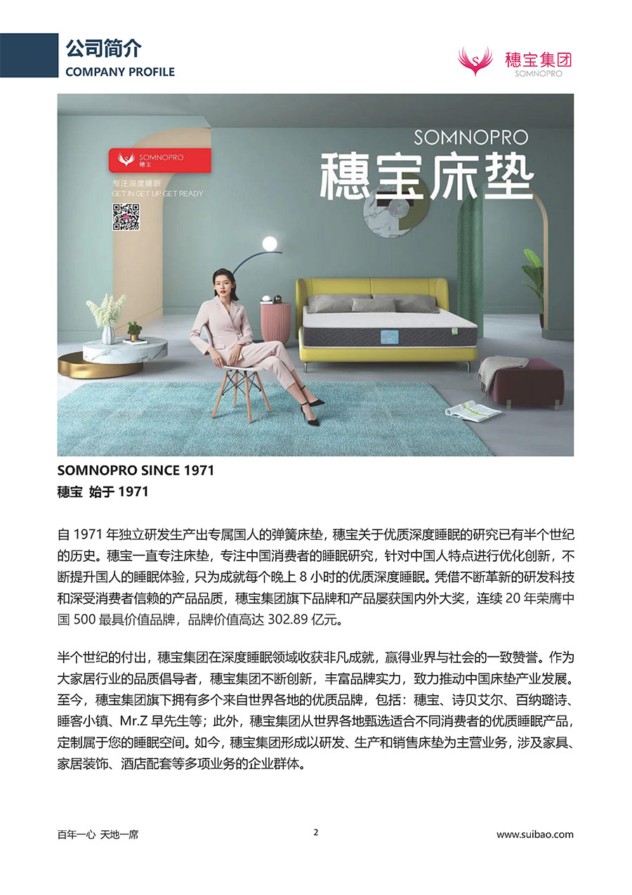 自1971年獨(dú)立研發(fā)生產(chǎn)出專屬國(guó)人的彈簧床墊,穗寶關(guān)于優(yōu)質(zhì)深度睡眠的研究已有半個(gè)世紀(jì)的歷史。穗寶一直專注床墊,專注中國(guó)消費(fèi)者的睡眠研究,針對(duì)中國(guó)人特點(diǎn)進(jìn)行優(yōu)化創(chuàng)新,不斷提升國(guó)人的睡眠體驗(yàn),只為成就每個(gè)晚上8小時(shí)的優(yōu)質(zhì)深度睡眠。憑借不斷革新的研發(fā)科技和深受消費(fèi)者信賴的產(chǎn)品品質(zhì),穗寶集團(tuán)旗下品牌和產(chǎn)品屢獲國(guó)內(nèi)外大獎(jiǎng),連續(xù)20年榮膺中國(guó)500最具價(jià)值品牌,品牌價(jià)值高達(dá)302.89億元。