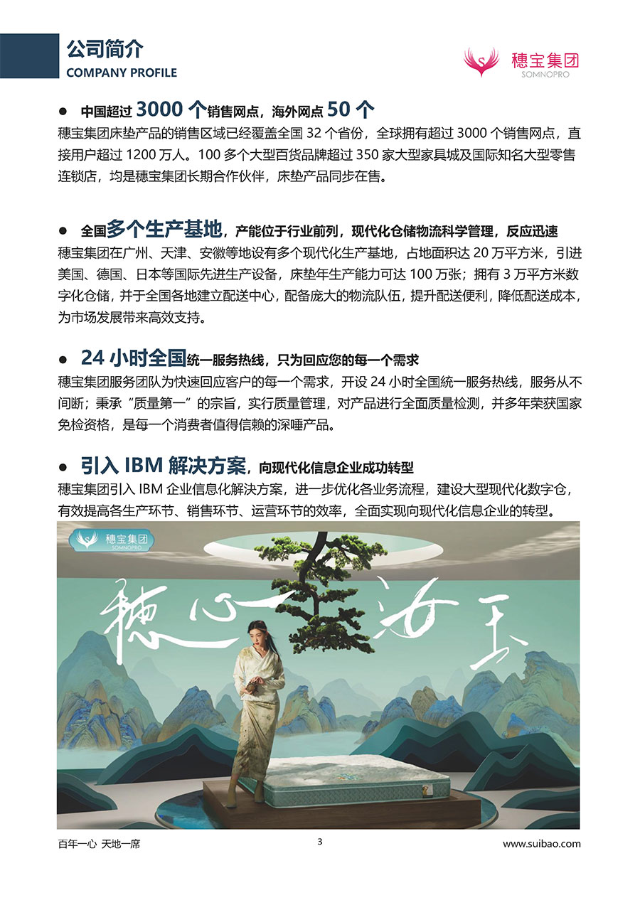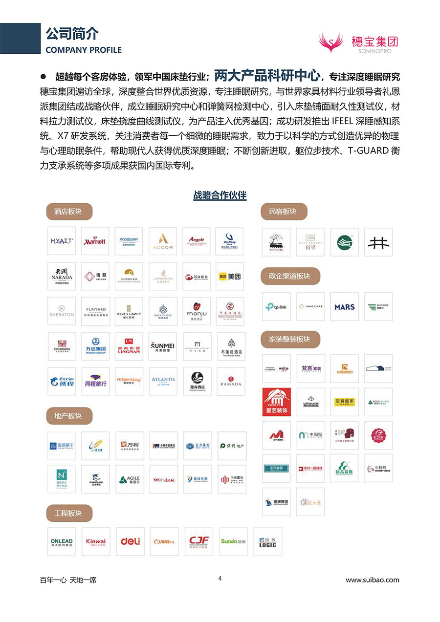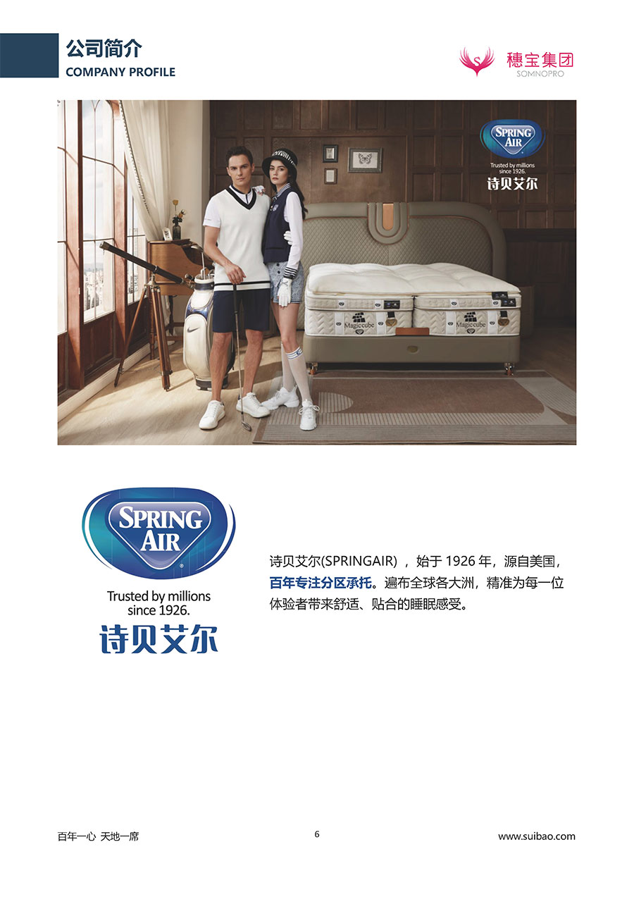 半個(gè)世紀(jì)的付出,穗寶集團(tuán)在深度睡眠領(lǐng)域收獲非凡成就,贏得業(yè)界與社會(huì)的一致贊譽(yù)。作為大家居行業(yè)的品質(zhì)倡導(dǎo)者,穗寶集團(tuán)不斷創(chuàng)新,豐富品牌實(shí)力,致力推動(dòng)中國(guó)床墊產(chǎn)業(yè)發(fā)展。至今,穗寶集團(tuán)旗下?lián)碛卸鄠€(gè)來自世界各地的優(yōu)質(zhì)品牌,包括:穗寶、詩(shī)貝艾爾、百納璐詩(shī)、睡客小鎮(zhèn)、Mr.Z早先生等;此外,穗寶集團(tuán)從世界各地甄選適合不同消費(fèi)者的優(yōu)質(zhì)睡眠產(chǎn)品,定制屬于您的睡眠空間。如今,穗寶集團(tuán)形成以研發(fā)、生產(chǎn)和銷售床墊為主營(yíng)業(yè)務(wù),涉及家具、家居裝飾、酒店配套等多項(xiàng)業(yè)務(wù)的企業(yè)群體。