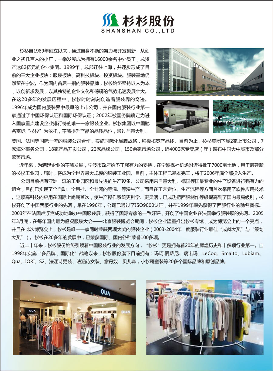 杉杉自1989年創(chuàng)立以來(lái),通過(guò)自身不斷的努力與開(kāi)發(fā)創(chuàng)新,從創(chuàng)業(yè)之初幾百人的小廠,一舉發(fā)展成為擁有16000余名中外員工,總資產(chǎn)達(dá)82億元的企業(yè)集團(tuán)。1999年,總部遷往上海,并逐步形成了目前的三大企業(yè)板塊:服裝板塊、高科技板塊、投資板塊。服裝基地仍然留在寧波。作為國(guó)內(nèi)首屈一指的服裝品牌,杉杉始終堅(jiān)持以人為本,以創(chuàng)新求發(fā)展,以其獨(dú)特的企業(yè)文化和磅礴的氣勢(shì)迅速發(fā)展壯大。在這20多年的發(fā)展歷程中,杉杉時(shí)時(shí)刻刻創(chuàng)造著服裝界的奇跡。1996年成為國(guó)內(nèi)服裝界中最早的上市公司,并在國(guó)內(nèi)服裝行業(yè)第一家通過(guò)了中國(guó)環(huán)保認(rèn)證和國(guó)際環(huán)保認(rèn)證;2002年被國(guó)務(wù)院確定為進(jìn)入國(guó)家重點(diǎn)建設(shè)企業(yè)排行榜的唯一一家服裝企業(yè)。杉杉集團(tuán)以中國(guó)馳名商標(biāo)“杉杉”為依托,不斷提升產(chǎn)品的品質(zhì)品位,通過(guò)與意大利、美國(guó)、法國(guó)等國(guó)際一流的服裝公司合作,實(shí)施國(guó)際化品牌戰(zhàn)略,積極拓寬產(chǎn)品線。目前為止,杉杉集團(tuán)下屬2家上市公司,7家海外事務(wù)公司,18家產(chǎn)品開(kāi)發(fā)公司,22家品牌公司,150余家市場(chǎng)公司,近4000家專賣(mài)店(廳)遍布中國(guó)大中城市及部分歐美市場(chǎng)。
