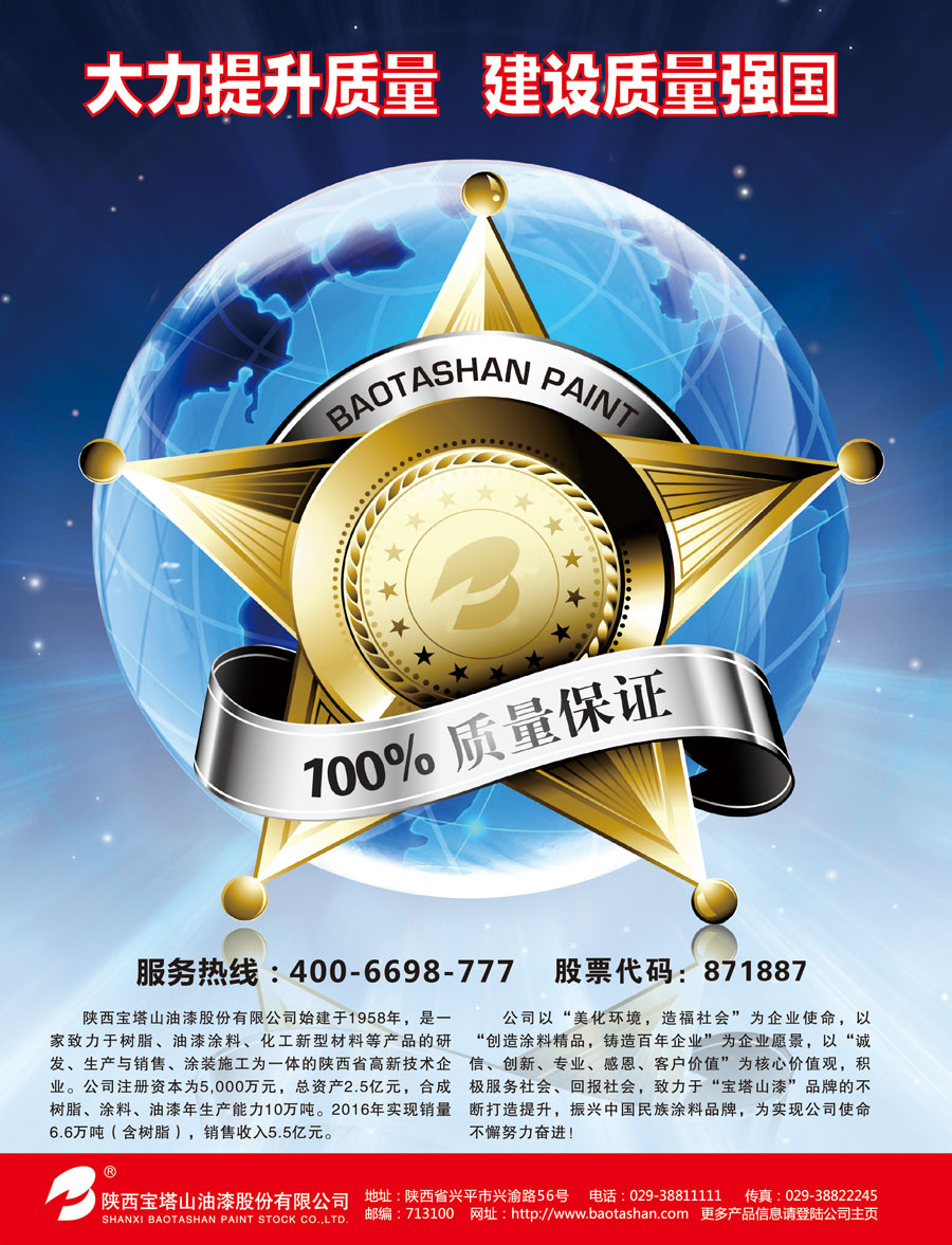 陜西寶塔山油漆股份有限公司始建于1958年,公司生產(chǎn)基地位于歷史文化名城陜西省興平市,是一家致力于樹(shù)脂、油漆涂料、化工新型材料等產(chǎn)品的研發(fā)、生產(chǎn)與銷(xiāo)售、涂裝施工為一體的陜西省高新技術(shù)企業(yè)。憑借近60年的不懈努力,在合成樹(shù)脂、醇酸漆、民用建筑涂料、工業(yè)用防腐涂料、特種涂料等方面技術(shù)成熟,成為我國(guó)涂料領(lǐng)域的優(yōu)秀民族品牌。近年來(lái),公司始終堅(jiān)持高科技、高品質(zhì)的技術(shù)發(fā)展戰(zhàn)略,時(shí)刻關(guān)注市場(chǎng)需求,不斷創(chuàng)新,致力于客戶成功,在工業(yè)防腐涂料、建筑涂料等環(huán)保涂料以及軍工等特種功能涂料方面,突破傳統(tǒng)工藝、引用前沿新技術(shù)、新材料、引領(lǐng)綠色涂料新變革,為消費(fèi)者帶來(lái)更環(huán)保、更安全、更高科技含量的產(chǎn)品和貼心的服務(wù)。