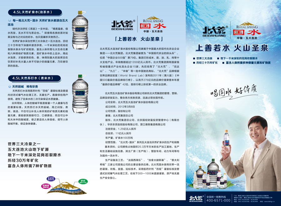 北大荒五大連池礦泉水股份有限公司成立于2012年3月8日,隸屬于北大荒集團(tuán)總公司,其股東為:北大荒集團(tuán)總公司、北京國經(jīng)財(cái)富投資管理中心(有限合伙)、華農(nóng)農(nóng)資連鎖股份有限公司、營口港務(wù)集團(tuán)有限公司。其注冊(cè)資金1.25億元人民幣,總投資11億元人民幣。北大荒五大連池礦泉水股份有限公司擁有占地面積20.3萬平方米的生產(chǎn)加工基地,生產(chǎn)和生活基礎(chǔ)設(shè)施完善,由主廠房(生產(chǎn)線)、塑膠車間、動(dòng)力車間、辦公樓、食堂宿舍及相關(guān)附屬設(shè)施組成。其經(jīng)營范圍為“北大荒•國水”系列五大連池天然礦泉水的生產(chǎn)和銷售,礦泉水年產(chǎn)量100萬噸。
