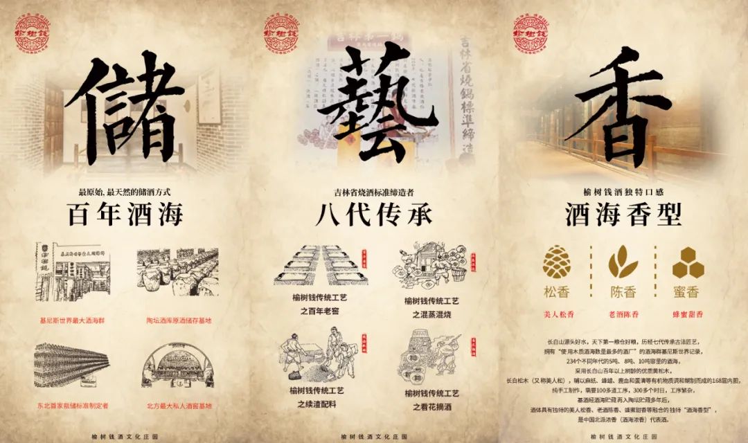 好的品牌需要好的品質(zhì)作為支撐。長(zhǎng)白山源頭好水,天下第一糧倉(cāng)好糧,歷經(jīng)八代傳承古法匠藝,234個(gè)不同年代的酒海,采用長(zhǎng)白山百年以上樹(shù)齡的優(yōu)質(zhì)黃松木,長(zhǎng)白松木(又稱美人松),輔以麻紙、蜂蠟、鹿血和蛋清等有機(jī)物質(zhì)調(diào)和糊制而成的168層內(nèi)膽,純手工制作,需要100多道工序,300多個(gè)時(shí)日,工序繁雜,基酒經(jīng)酒海貯藏再入陶壇貯藏多年后,酒體則具有獨(dú)特的美人松香、老酒陳香、蜂蜜甜香,是榆樹(shù)錢酒業(yè)獨(dú)特的“酒海香型”。