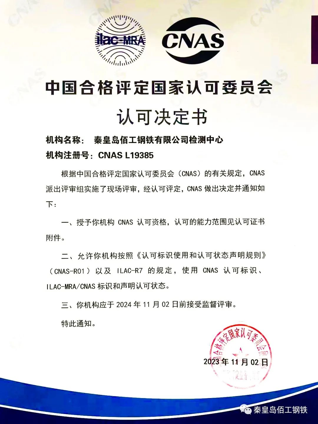 秦皇島佰工鋼鐵有限公司榮獲國家CNAS實驗室認可