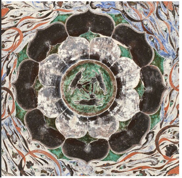 「三兔共耳」源于敦煌石窟第407窟頂中央藻井的“三兔聯(lián)跑蓮花紋”。在這個(gè)開(kāi)鑿于隋代的洞窟中,窟頂中央繪制了數(shù)層八瓣大蓮花;周遭環(huán)繞著衣帶飄飄、手持花盤的飛天形象;蓮花中心則繪制了三只追逐奔跑的兔子。畫(huà)師以巧思將每只兔子二只耳朵中的一只重疊,看似三兔三耳,但以每只兔子各自的角度觀察,則雙耳俱全。三只兔耳組成等邊三角形,配合外圍的蓮瓣與飛天,不僅兔子奔跑跳躍的神態(tài)生動(dòng)逼真,整個(gè)藻井紋飾也都充滿了動(dòng)感!