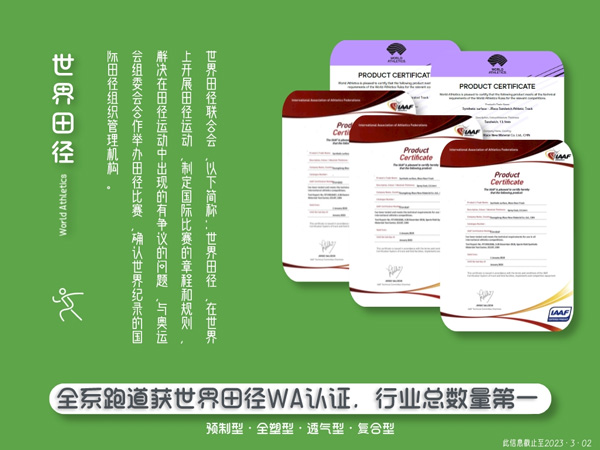 榮獲WA認(rèn)證的運(yùn)動(dòng)地材產(chǎn)品,意味著國(guó)際田聯(lián)的背書和肯定,在品質(zhì)、使用體驗(yàn)、安全性等諸多方面達(dá)到國(guó)際專業(yè)競(jìng)賽要求。