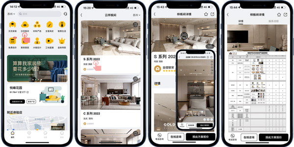 客戶想看整裝樣板間?不一定要去線下展館,一部手機(jī)就能逛夠癮。在金螳螂家APP“云樣板間”里,就可720云VR觀看各個空間的效果,里面可查看超詳細(xì)的空間材料配置表,都是優(yōu)質(zhì)大牌產(chǎn)品,還能隨時隨地針對產(chǎn)品進(jìn)行在線咨詢,并按照戶型預(yù)估樣板間設(shè)計報價。