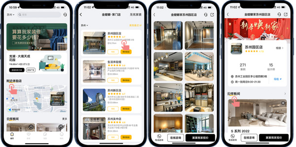 目前,金螳螂家在全國擁有150家門店,客戶可以通過“附近體驗(yàn)店”選擇客戶所在城市的服務(wù)門店,在這里可以了解到該門店的720度VR全景樣板間、案例、設(shè)計師以及客戶的真實(shí)評價,不用出門探訪實(shí)體門店,就能快速了解門店情況,省時又省力!