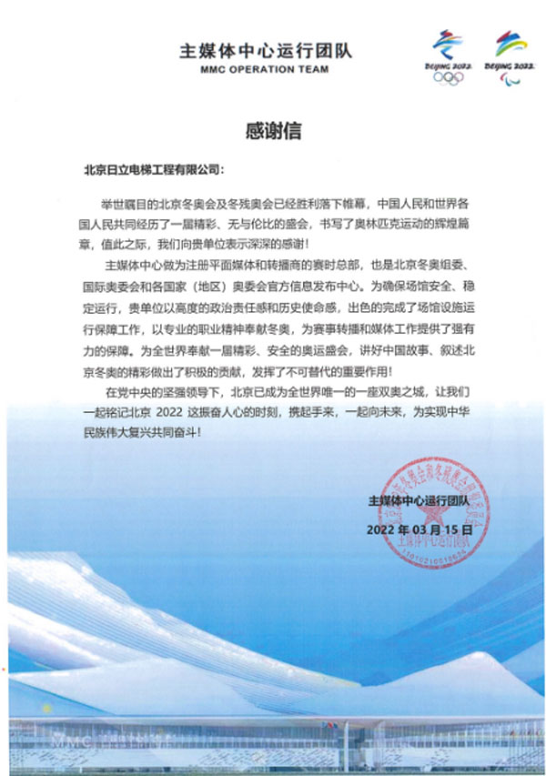 日立電梯還為第24屆北京冬季奧林匹克運動會兩大賽區(qū)6大場館、提供了超過200臺電扶梯產(chǎn)品,包括唯一新建冰上競賽場館“冰絲帶”,并且在長達兩個多月的駐點保障期間達成零故障護航目標(biāo),贏得冬奧組委的認(rèn)可。