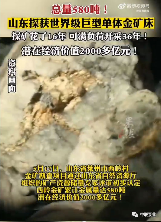 山東萊州市西嶺村金礦勘查項(xiàng)目通過省自然資源廳組織的儲(chǔ)量專家評(píng)審,初步認(rèn)定西嶺金礦新增金金屬量近200噸,累計(jì)金金屬量達(dá)580噸,潛在經(jīng)濟(jì)價(jià)值2000多億元,是迄今為止國(guó)內(nèi)發(fā)現(xiàn)的最大單體金礦床。