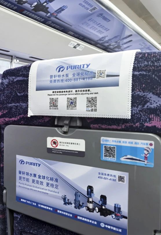 “普軒特號”高鐵專列以“普軒特水泵,全球化標準”為主旨,在車廂內(nèi)以全面覆蓋的宣傳形式,將專列打造成展示普軒特形象的“移動展廳”,深度刻畫普軒特對全球標準的堅定態(tài)度