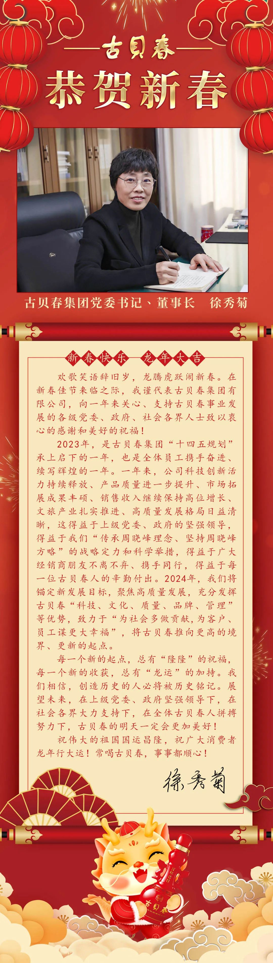 古貝春集團(tuán)有限公司黨委書記、董事長(zhǎng)徐秀菊攜全體員工恭祝全國(guó)人民新春快樂!