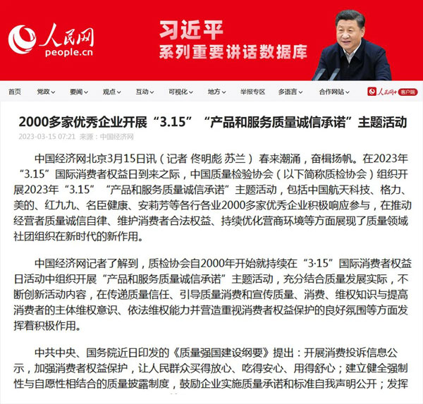 ——中國(guó)質(zhì)量檢驗(yàn)協(xié)會(huì)組織2000多家優(yōu)秀典范企業(yè)開(kāi)展“3.15”產(chǎn)品和服務(wù)質(zhì)量誠(chéng)信承諾活動(dòng)