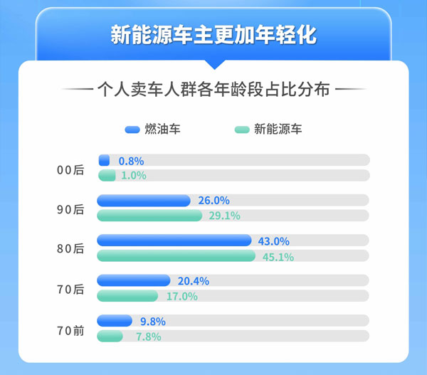 據(jù)天天拍車(chē)數(shù)據(jù)顯示,個(gè)人賣(mài)車(chē)車(chē)主年齡段分布占比,新能源車(chē)車(chē)主80后占比45.1%,90后占比29.1%,00后占比1.0%,對(duì)應(yīng)燃油車(chē)車(chē)主占比分別為43.0%,26.0%,0.8%。在越來(lái)越成熟的新能源汽車(chē)技術(shù)和促消費(fèi)政策的加持下,新能源汽車(chē)保有量不斷增加,確保了二手車(chē)市場(chǎng)交易中新能源二手車(chē)車(chē)源充足,不少消費(fèi)者在兼顧嘗“新”和性?xún)r(jià)比的心態(tài)下,選擇消費(fèi)新能源二手車(chē),不失為一個(gè)比較理性的消費(fèi)心理。