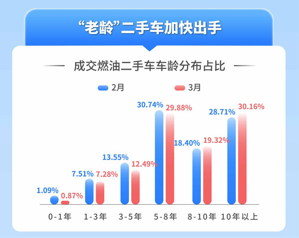 據(jù)天天拍車(chē)數(shù)據(jù)顯示,3月燃油二手車(chē)成交車(chē)齡分布中,8-10年車(chē)齡成交占比為19.32%,10年以上成交占比為30.16%,合計(jì)占比49.48%;相較于2月,8-10年車(chē)齡成交占比為18.40%,10年以上成交占比為28.71%,合計(jì)占比47.11%,環(huán)比提升2.37%。此外,3月0-3年車(chē)齡的次新車(chē)成交占比為8.15%,比2月微跌0.45%,3-8年車(chē)齡成交占比為42.37%,比2月下降1.92%。數(shù)據(jù)顯示了在多重因素影響下,車(chē)主一方面選擇出手“老齡車(chē)”,對(duì)于次新車(chē)選擇“惜售”觀望。